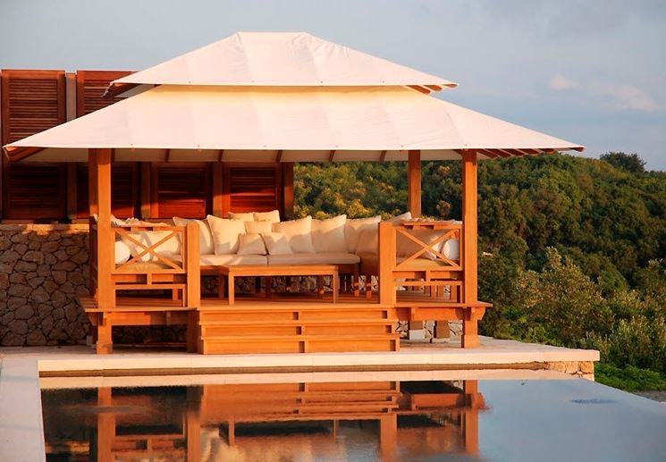 Ci siamo abbronzati, siamo rilassati dopo un pomeriggio di riposo sulla nostra chaise longue ed abbiamo goduto di un'ottima cena insieme ai nostri amici. Si è fatto scuro ed abbiamo voglia di chiacchierare, magari bevendo qualcosa, comodamente seduti su un divano ma non vogliamo chiuderci in salotto. Che si fa? Semplice: ci si dota di un gazebo e lo si arreda con divani, poltrone e tavolini bassi. In pochi metri quadri si ritrova il piacere di un soggiorno domestico sotto un tendone. Esistono in commercio svariati kit che già comprendono tutto il necessario per questo piccolo e confortevole angolo. L'arredamento prevede il gazebo in senso stretto e poi divani e poltrone in materiale inalterabile agli elementi (non dimentichiamoci che siamo all'aperto) e le relative cuscinerie. I materiali che compongono la strutture sono normalmente legno o ferro battuto anche se i modelli più economici possono utilizzare semplici tubi verniciati. Anche qui il teak di forte spessore rappresenta probabilmente la scelta migliore, vuoi per la bellezza di questo nobile materiale, vuoi per la sua durata (che compensa il maggior costo).