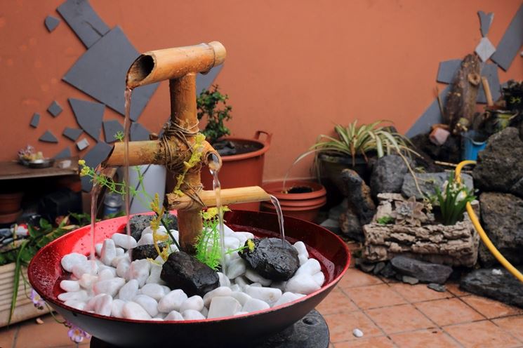 Per la realizzazione di una fontana zen occorrono materiali facilmente reperibili presso negozi specializzati. Se si vuole realizzare una struttura in bambù, occorre avere a disposizione: un vaso o un contenitore con un’apertura larga, dello spago, colla, tre bambù con diametro di circa 2 cm, uno lungo 15 e largo 5 cm, una pompa e un tubo per la circolazione dell’acqua. Unisci i tre pezzi di bambù con diametro più piccolo utilizzando lo spago; posiziona questa base a un lato del vaso. Successivamente incolla a questa struttura il pezzo di bambù con diametro più largo utilizzando della colla. Ricorda d’inclinarlo leggermente in modo tale da far scivolare l’acqua sulla base del vaso. A questo punto si sistema la pompa sul fondo del vaso; il tubo si fa passare sopra e dietro la base della fontana, e si fa entrare dentro il bambù più largo di almeno 5 cm. Il tubo può essere fissato con del nastro, ricordando di fare in modo che non si bagni e si stacchi dal supporto. Infine si riempie il contenitore d’acqua e si attiva la pompa. È possibile sistemare delle pietre decorative, o piantine che nascondano la pompa.