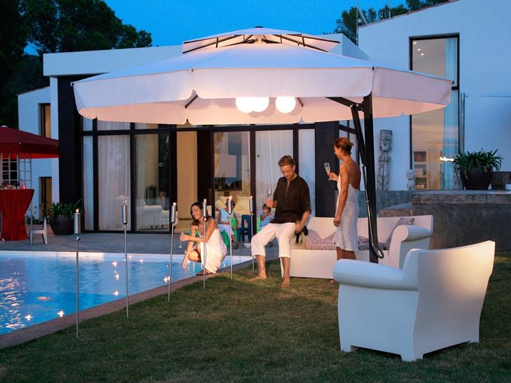 L’ombrellone da giardino si evolve per contribuire a un arredo da esterno sempre più completo. Possiamo trovarlo anche nella versione con tende: si tratta di un ombrellone fisso che lateralmente può essere chiuso per mezzo di tende che all’occorrenza si avvolgono, per creare un ambiente più intimo ma anche per ripararsi eventualmente dagli insetti. Il tessuto delle tende può essere semplice e molto economico ma anche molto prezioso e chic: talvolta si trovano anche modelli di ombrelloni da giardino con delle tende in velo, come se fossero delle zanzariere.