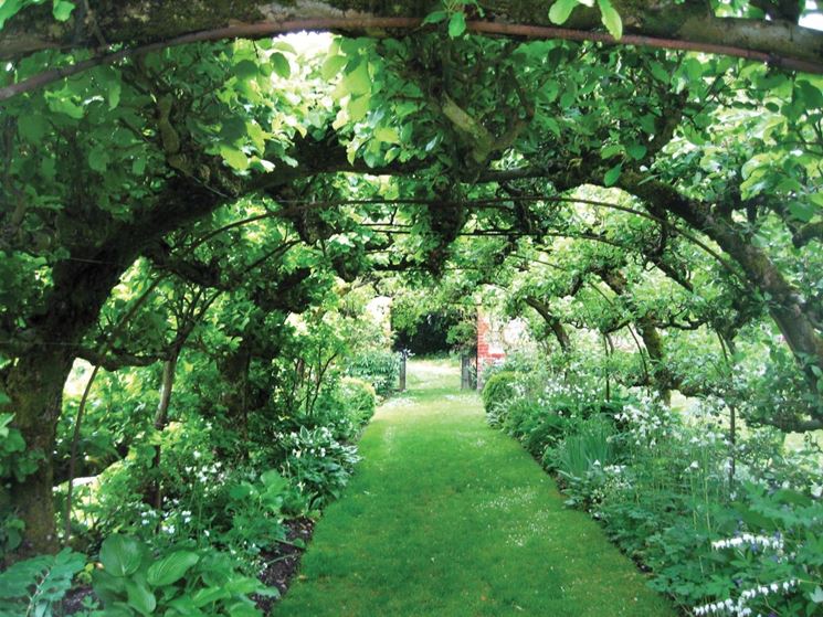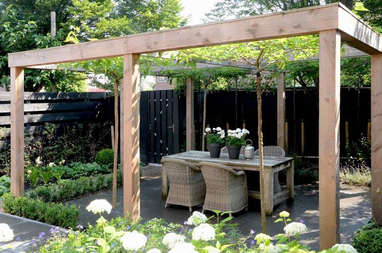 La copertura del pergolato può essere realizzata con tante piante diverse: quella utilizzata per antonomasia è la vite, ma in genere sono diffuse tutte le specie rampicanti. Molto apprezzate sono le rose e il glicine, che consentono di mettere a punto una struttura decorativa basata sui profumi intensi e sui colori vivaci. Valide alternative sono l'edera e la buganvillea. La struttura può essere in acciaio zincato oppure in legno naturale trattato in modo che possa resistere agli agenti atmosferici. In genere hanno forme semplici e possono integrare la pietra per i pilastri, mentre le travi sono in legno grezzo di castagno. Se invece si vuole realizzare una struttura più elegante si possono avere pareti semichiuse formate da pertiche di frassino e castagno flessibili e intrecciate, coperte da piante occludenti.