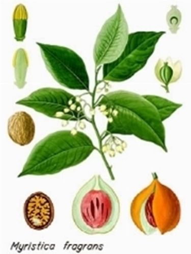 Il seme della Myristica fragrans, cioè la noce moscata propriamente detta, contiene un olio essenziale, sostanze terpeniche e oli grassi da cui si ricava il burro di noce moscata. L’arillo ( la buccia rossa esterna) presenta la stessa composizione del seme, con una netta prevalenza di composti fenilpropanici. I composti fenolici della noce moscata hanno la proprietà di inibire la sintesi delle prostaglandine ( sostanze che scatenano il dolore), in alcune mucose e prevalentemente nel colon. Per questo motivo la noce moscata si impiega come analgesico e carminativo in caso di dolori di stomaco. Le molecole della noce moscata presentano anche proprietà antibatteriche e secondo studi condotti nei ratti, anche inibitrici del transito intestinale, dunque, effetti antidiarroici. Il macis, cioè l’arillo che avvolge la noce moscata ha proprietà antinfiammatorie, digestive ed aromatiche, ma viene usato per lo più come condimento. Proprietà digestive e antiemetiche sono presenti nella noce moscata che da sempre è stata impiegata per calmare nausea e vomito. Le proprietà analgesiche della stessa ne permettono l’impiego per trattare i dolori reumatici e muscolari di tipo acuto. Le proprietà dell’olio essenziale sono utili per combattere il raffreddore e il catarro. Altre proprietà positive della noce moscata sono quelle antinfiammatorie, antibiotiche e lenitrici. La noce moscata presenta solo una caratteristica negativa: l’effetto allucinogeno dovuto, sembra, alla presenza di acido mistrico ed elimicina, acidi o acenilbenzeni che provocherebbero stordimento e allucinazioni simili a quelli indotti da droghe di sintesi come l’Lsd.