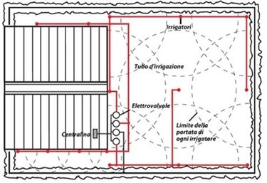 La progettazione è senz'altro la fase che richiede una maggiore dedizione perché, una volta che si sono stabiliti i punti precisi dove collocare gli irrigatori, sarà più facile eseguire il lavoro manualmente. Per facilitare le operazioni di scavo nei punti giusti, si consiglia di collocare dei picchetti che indicheranno il percorso che lo scavo dovrà seguire. Lo scavo deve essere realizzato a una certa distanza dalla vegetazione e avere una profondità minima per collocare all'interno il tubo che sarà successivamente ricoperto di terra. Al tubo saranno collegati gli irrigatori. Prima di chiudere lo scavo si consiglia comunque di collaudare l’impianto e verificarne il corretto funzionamento, così che non si debba successivamente scavare per cercare il guasto. Solo dopo aver verificato che il sistema funziona lo scavo può essere ricoperto con il terreno. Si tratta di un impianto molto richiesto per l'irrigazione dei giardini perché consente di essere collegato a un automatismo che farà entrare in funzione l'irrigazione secondo tempi e modalità impostati, una comodità soprattutto quando il padrone di casa non può occuparsi personalmente dell’accensione dell'impianto.