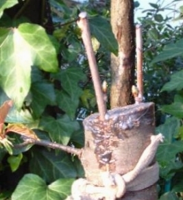 Nelle varietà di fico selvatico, molti coltivatori preferiscono praticare l’innesto a spacco, pratica colturale dove si innestano rami contenenti due o tre gemme. Questi rami vengono chiamati anche marze. Nel fico selvatico si possono praticare due tipi di innesto a spacco, quello comune o quello a corona. Nel primo caso verrà utilizzata solo una marza, mentre nel secondo si procederà a inserire almeno quattro marze. Le marze si prelevano a forma di penna, cioè con la parte finale del ramo che assume proprio la forma di una penna. Il rametto, portante alla base almeno tre gemme vigorose, dovrà essere lungo almeno dieci centimetri. Sul legno della pianta madre si pratica un taglio orizzontale, in modo da creare una superficie pianta, tonda e dal diametro di circa quattro centimetri. Nell’innesto a corona si procederà a inserire una sola marza nella parte centrale del portainnesto, dove si aprirà una fenditura a forma di cuneo, mentre in quello a spacco comune le quattro marze si inseriranno ai lati, facendo attenzione che la parte esterna sia più lunga di quella inserita nella fenditura del portainnesto, in modo da far affiorare all’esterno la prima gemma e da bloccare il ramo all’interno della fenditura. Ogni incisione dovrà avere una distanza di circa tre centimetri l’una dall’altra. Le marze vengono tenute stabili al legno legandole con della rafia umida, che va stretta il più possibile attorno al diametro del legno segnato dalle fenditure, mentre la base dei rametti innestati va ricoperta e protetta con del mastice. L’innesto a spacco va praticato in primavera, quando la pianta è in succhio e la corteccia si stacca facilmente dal legno. Se il fico dovesse presentare una corteccia poco resistente all’innesto a corona, meglio praticare quello a spacco comune o a gemma.