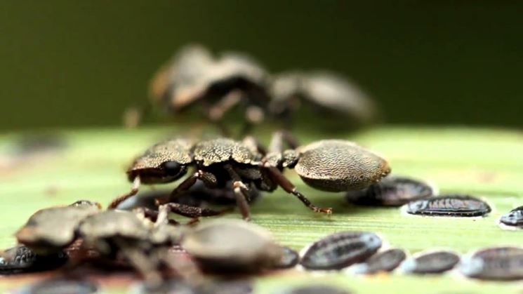 cocciniglia1 La riproduzione della cocciniglia può essere asessuata o per partenogenesi derivante da individui ermafroditi che possiedono sia gli organi genitali maschili che quelli femminili. Le cocciniglie possono essere ovipare e vivipare, ma anche ovovivipare. Nel primo caso depongono delle uova da cui nasceranno gli insetti giovani, sotto forma di neanidi, nel secondo, le stesse nasceranno dal ventre della madre, mentre nel terzo, le uova con gli embrioni già formati, si schiudono sempre nel ventre della madre. Lo stadio larvale della cocciniglia, come già detto, è la neanide, che attraversa solo tre stadi prima di diventare adulta. Anche le neanidi si nutrono della linfa delle piante rimanendo fissamente attaccate alle foglie. Le femmine di alcune specie di cocciniglie possono deporre da 400 a 600 uova, divenendo altamente infestanti. Le uova della cocciniglia possono schiudersi tra marzo, giugno e settembre, con qualche variazione del ciclo biologico dell’insetto, legata alla specie a cui appartiene. In un solo anno, la cocciniglia può dare vita a ben tre generazioni di neanidi. La sottoclasse di appartenenza delle cocciniglie determina anche il colore del parassita che può essere bianco, giallo, rossastro o marrone.