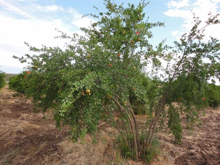 La potatura melograno a cespuglio è quella più usata, poiché asseconda il naturale portamento della pianta e non richiede di effettuare numerosi tagli. In fase di impianto della pianta è necessario osservare le ramificazioni, individuare quelle più spesse e rimuovere le altre tagliandole al punto di attaccatura alla pianta. I rami lasciati vanno cimati, il taglio netto deve essere fatto a circa 30 cm dal suolo. La potatura va eseguita alla fine dell'inverno per permettere alla pianta di riprendere il ciclo vegetativo in primavera. Di anno in anno vanno eliminati sia le nuove ramificazioni che spunteranno dal terreno, sia i rami superflui dei polloni. È necessario far aprire il cespuglio verso l'esterno, la luce e l'aria deve passare tra i rami, solo così i frutti potranno maturare più velocemente. A sviluppo completo, il melograno avrà un'altezza di circa 2m.