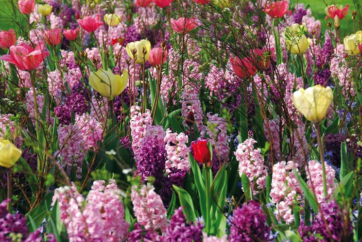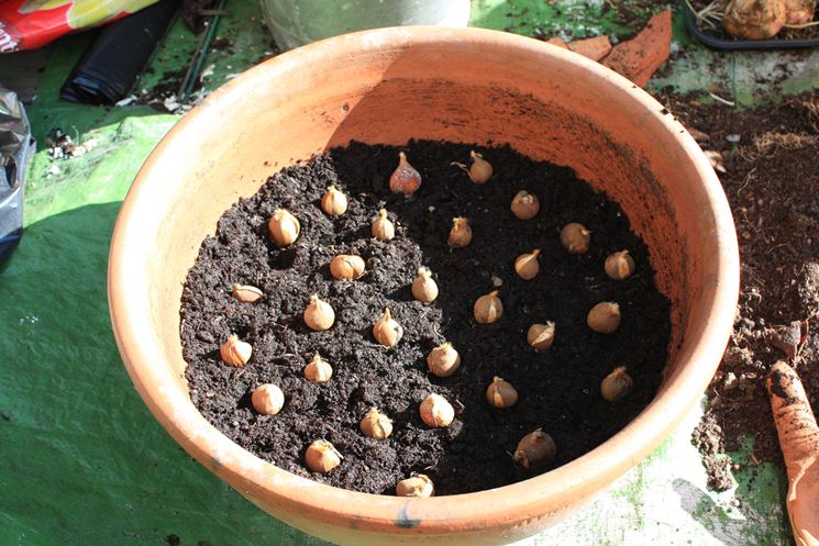 I bulbi da fiore sono di diverse dimensioni e per questo vanno sistemati nella terra a profondità diverse. Questo particolare può essere utilizzato per avere, in un vaso, una fioritura continua per molti mesi. Si tratta semplicemente di utilizzare un vaso piuttosto grande e, dopo aver provveduto a mettere lo strato di ghiaia o altro materiale drenante, si fa uno strato di terriccio. Su questo vanno sistemati i bulbi più grandi, come possono essere quelli di amarillide, di giacinti, di alcuni narcisi e di fritillarie. Si coprono con qualche decina di centimetri di terriccio e si sistemano bulbi di dimensioni più piccole, come muscari, tulipani, allium. Ancora terra ed infine i bulbi più piccoli: crochi, anemoni, galanthus e piccoli narcisi. Con questo semplice accorgimento si avrà una fioritura di bulbi da fiore continua per diversi mesi. Se si acquistano bulbi da fiore bisogna accertarsi che siano duri, senza parti molli, senza segni di marciume o altre imperfezioni. I bulbi da fiore non possono mancare nel giardino di un appassionato di giardinaggio.
