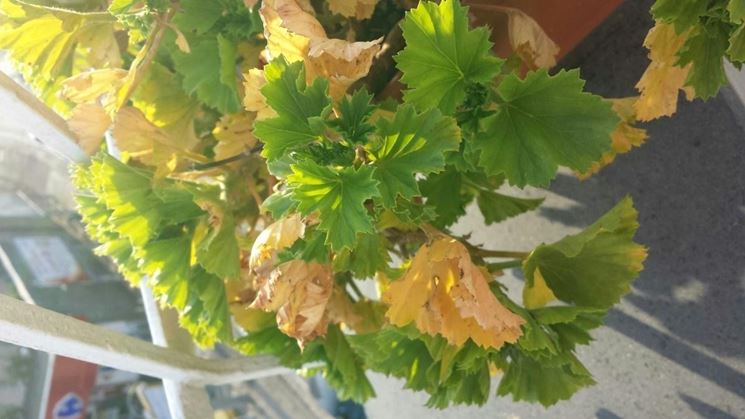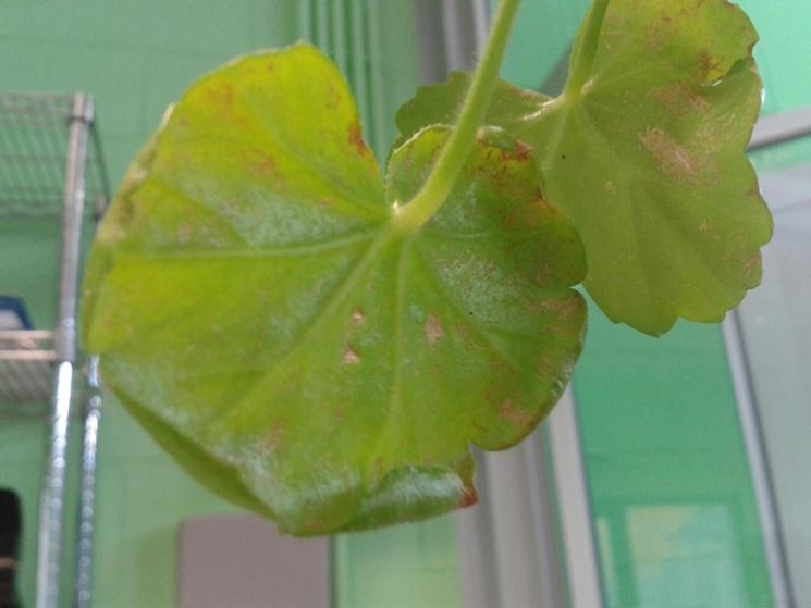 Se un geranio presentasse sulla pagina inferiore della foglia delle bolle di colore rosso sarebbe stato attaccato dalla ruggine. Per combattere tale malattia sarebbe opportuno eliminare le foglie colpite e eliminare gli eventuali ristagni d'acqua nel vaso. Alcuni batteri come lo Xantomonas possono colpire i gerani causando ingiallimenti sulle foglie. Le foglie attaccate dal batterio si ripiegano su loro stesse causando un deperimento della pianta che non riesce più a sostentarsi adeguatamente. Non è possibile curare la malattia in stadio avanzato, per questo sarebbe opportuno prevenirla eliminando totalmente le piante malate e il terreno in cui veniva coltivata, in modo da evitare che la malattia si propaghi alle piante vicine. Per riuscire a disinfettare le piante si dovrebbero utilizzare prodotti a base di rame.