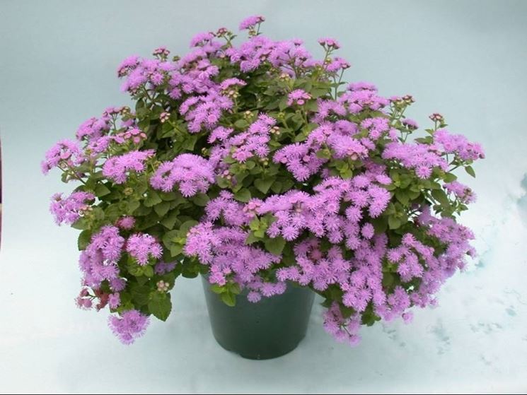 Il genere Ageratum contiene circa 60 specie, ma tra queste l’unica che viene coltivata come pianta ornamentale è Ageratum houstonianum. E’ una pianta originaria del Messico che prende il nome dal botanico W. Houston; ha foglie verde chiaro e fiori dalla forma a pompon di colore diverso a seconda della varietà; i fiori possono essere celesti, lilla, rosa, bianchi.