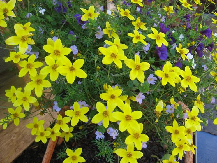 Il bidens fiorisce dalla primavera inoltrata, fino all’autunno. La fioritura è solitamente molto abbondante; i fiori hanno una forma a stella, sono formati da cinque petali e sono di colore giallo dorato. I fiori sono apprezzati per il loro colore vivace, che rallegra gli ambienti.