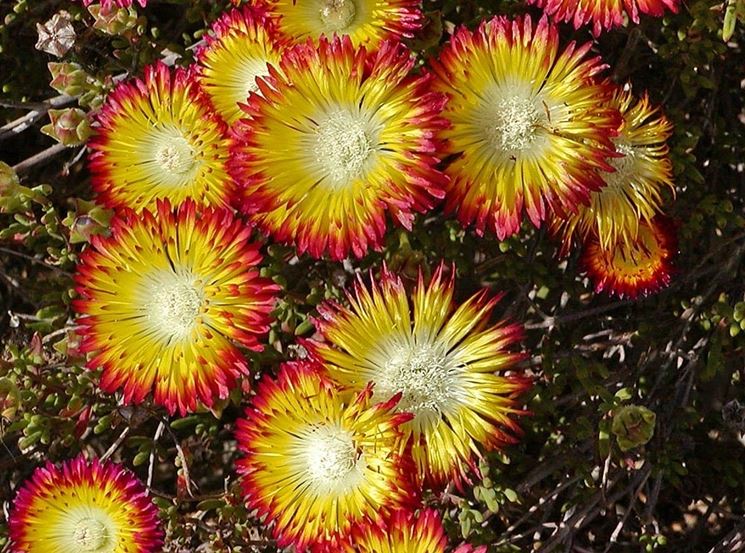 Le specie succulente denominate Mesembryanthemum, appartengono alla famiglia delle Aizoaceae e sono originarie del continente africano meridionale. Si caratterizzano principalmente, per l'allegra fioritura che si dischiude solo se le piante sono riposte in zone molto soleggiate. Generalmente, i fiori sbocciano in tarda primavera, sono appiattiti e possono essere di colore rosa acceso, bianco e arancione. La maggior parte delle specie ha il fogliame di forma cilindrica, stretto e carnoso, verde intenso. Non richiedono eccessive attenzioni colturali, il terriccio è drenato, non troppo ricco e viene mescolato con della sabbia grossolana. Temono le temperature inferiori ai cinque gradi e possono essere coltivate sia in vaso che in terra. Le irrigazioni sono necessarie principalmente in estate mentre delle concimazioni periodiche in primavera, aiutano lo sviluppo vegetativo.