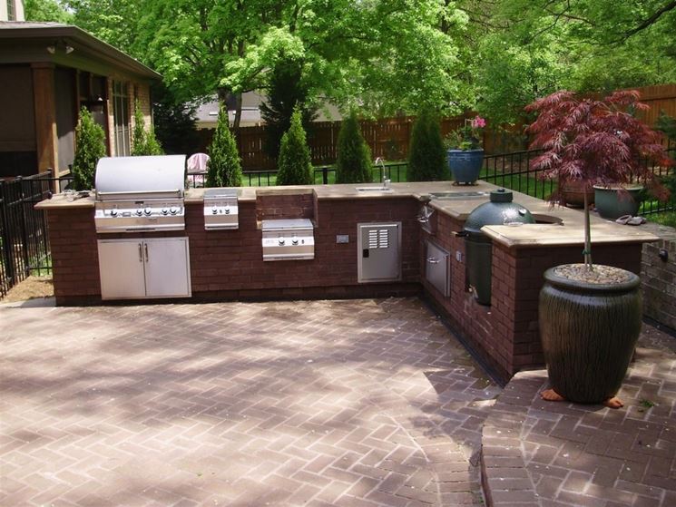 Le soluzioni per costruire una cucina da esterno sono numerose: per questo, è indispensabile tenere conto di alcuni importanti accorgimenti: oltre alle condizioni climatiche tipiche del posto in cui si vive, bisogna capire dove sistemare lo spazio cottura, al fine di non contaminare con fumi e odori troppo invadenti l’area destinata al consumo delle pietanze. Gli elementi indispensabili per una cucina da esterno funzionale sono: il lavandino, che nel caso di una cucina compatta può essere sostituito da un serbatoio nel caso in cui sussistano problemi con l’allaccio con la rete idrica; lo spazio cottura, con fornelli e griglie, preferibilmente costituito da un sistema ibrido; uno spazio di appoggio, che può essere utilizzato sia per far accomodare gli ospiti e servire aperitivi o antipasti, sia per cucinare, affettare e mescolare gli ingredienti da infornare o da servire per cena. Una cucina da esterno può prevedere anche un frigorifero, ma questo dipende dallo spazio che si ha disposizione e dai collegamenti con la rete elettrica. Da ricordare che tra le tipologie di cucina da esterno più gettonate ci sono quelle in muratura e in acciaio inox.