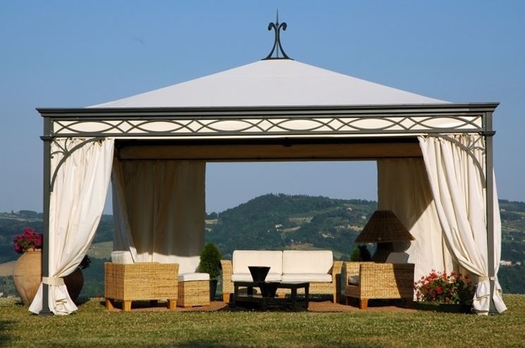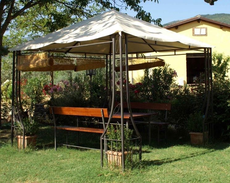 Esistono prevalentemente due tipologie di gazebo in ferro battuto: il gazebo autoportante e il gazebo addossato. Il primo modello, composto da quattro elementi portanti, può essere collocato in qualsiasi parte del giardino e richiede più spazio per essere disposto correttamente. Il gazebo addossato, invece, va appoggiato a una parete ed è costituito soltanto da due elementi portanti. Rappresenta un'ottima soluzione per chi non ha ampi spazi a disposizione La forma del gazebo autoportante è generalmente quadrata, con i quattro elementi che svolgono la funzione di sostegno e una copertura superiore per evitare che i raggi del sole giungano all'interno dell'area. Le coperture, presenti anche nei modelli addossati, sono solitamente in tela, anche se non mancano modelli realizzati in plastica. Oltre alle coperture superiori, è possibile aggiungere delle coperture laterali.