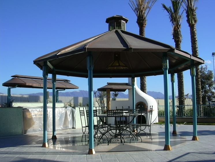 Oltre che per la resistenza e per la duttilità, il ferro battuto è apprezzato per via del suo elegante colore naturale, rendendone superflua la verniciatura. Essendo un materiale di facile lavorazione, per quanto riguarda la costituzione dei gazebo, è possibile scegliere personalmente il tipo di forma da dare alla struttura, selezionando a proprio piacimento le decorazioni da inserire. Altro vantaggio del ferro battuto è rappresentato dall'eccellente resistenza agli agenti atmosferici: il materiale sopporta in modo ottimale il vento, la pioggia e l'umidità, non necessitando di essere smontato durante le stagioni piovose. Ottima anche la durata nel tempo: un gazebo in ferro battuto di buona qualità garantisce un elevato numero di anni di utilizzo, senza presentare particolari segni di usura.