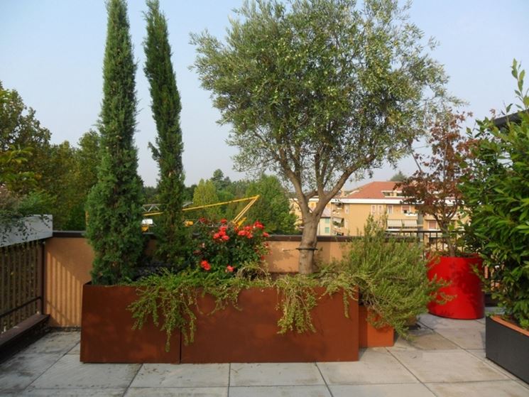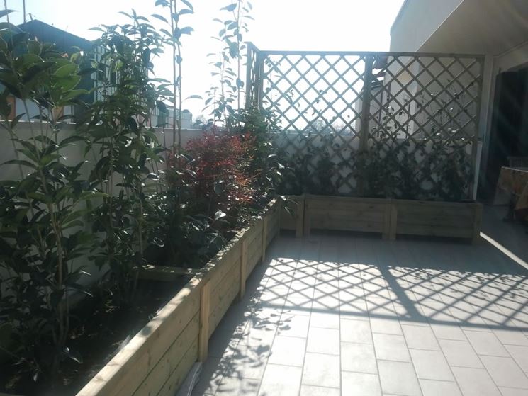 Se avete delle fioriere sul terrazzo, la scelta delle piante dipende da quanto spazio e terriccio avete a disposizione nei vasi: le piante di solito sviluppano un apparato radicale di dimensioni proporzionali allo sviluppo aereo di rami e foglie; quindi se avete una piccola fioriera di pochi centimetri, difficilmente potrete coltivare grandi arbusti o rampicanti. Quando scegliete le fioriere da posizionare sul vostro terrazzo è fondamentale acquistare i contenitori più grandi possibili, in modo da avere maggiore scelta sulle piante da coltivare. Nelle fioriere appese si coltivano in genere piante da fiore annuali, o da coltivare come tali, come surfinie, gerani, nemesie, petunie. Nelle ampie vasche possiamo coltivare invece anche piante perenni o aromatiche, da utilizzare anche in cucina nel corso dell'anno. Se lo desideriamo potremo scegliere anche degli arbusti, da foglia o da fiore; visto che i vasi verranno posti sul terrazzo, in luogo riparato, potremo pensare di scegliere anche piante esotiche, con esigenze climatiche leggermente diverse da quelle del luogo in cui viviamo.