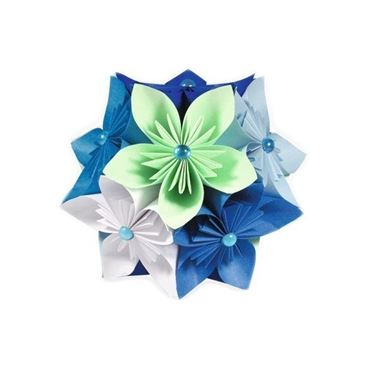 Quando i dodici fiori saranno montati, li incolleremo gli uni agli altri per formare la palla. Per farlo ognuno segue il proprio metodo, ma un buon sistema è formare prima le due semisfere per poi unirle. Cominciamo unendo al primo modulo fiore, gli altri cinque, uno per lato. Quindi uniamo le due parti insieme seguendo il disegno che si forma sotto i nostri occhi. Tecnicamente, stiamo costruendo un dodecaedro, figura comune tra i kusudama. Ad ogni pentagono corrispondono cinque triangoli. E a ben vedere, per ogni gruppo di cinque petali che formano un fiore, corrispondono tre fiori che si uniscono tra loro. Anche questa regolarità geometrica aiuta ad ottenere una figura armonica e gradevole alla vista. Per finire, scegliamo un bel nastro del colore che preferiamo, e con l'aiuto di un ago da lana o un uncinetto, lo facciamo passare attraverso il kusudama. Formeremo un occhiello grazie al quale poter appendere la nostra creazione dove più ci piace. La pazienza e dedizione che richiede questo lavoro verrà ben ripagata dal bel risultato che avremo tra le mani.