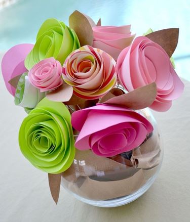 Se vorremo montare il nostro mazzolino di fiori ci serviremo di bastoncini o legnetti sottili, oppure di filo d’alluminio. Ne esiste di già colorato o rivestito, altrimenti potremo foderarlo a nostro piacimento con striscioline di carta avvolte tutt’intorno. Fare un fiore di carta semplice a spirale è un lavoretto divertente e veloce che può essere proposto anche ai bambini non troppo piccoli e che abbiano una certa dimestichezza con l’uso delle forbici. Per prima cosa sceglieremo un cartoncino o una carta non troppo leggera e ricaveremo un quadrato a cui smusseremo gli angoli. Un buon risultato si otterrà partendo da un cerchio, non importa che sia perfetto. A questo punto dovremo ritagliare in forma di spirale una striscia continua di carta di un paio di centimetri di spessore. Lo spessore della striscia determina l’altezza del fiore finale, quindi più sarà sottile la spirale, più il fiore sarà sottile e rigonfio, o viceversa.