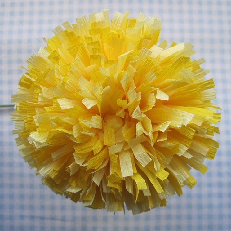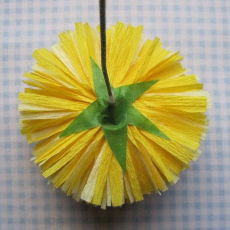 Fissiamo al gambo la carta crespa gialla che abbiamo preparato, usiamo pochissima colla per unire l’inizio della striscia al gambo, in questo modo non rischieremo di sporcare il lavoro. Una volta asciutta e ben salda allo stelo, arrotoliamo la carta crespa gialla per tutta la sua lunghezza facendo perno sul filo metallico foderato. Per evitare che il fiore si apra, mettiamo qualche goccia di colla alla base della striscia che stiamo avvolgendo. Usiamo poca colla alla volta, così da farla asciugare in fretta ed evitare che il fiore rimanga troppo umido e si apra. Per ultimo fissiamo la striscia di triangolini di carta verde con la quale faremo il calice del dente di leone. Passiamo un sottile strato di colla per tutta la lunghezza della strisciolina, ma senza toccare i triangoli, quindi attacchiamola al fiore di carta crespa gialla. Lasciamo asciugare per qualche istante ed spettiniamo un po’ le frange gialle e la base verde del fiore. Ed ecco pronto il nostro fiore di campo. Ci sono tanti modi per usare questo fiorellino, ad esempio per decorare un pacco dono, ma farà splendida figura anche da solo in un vaso di vetro in bella vista.