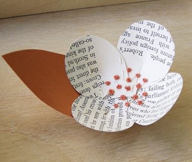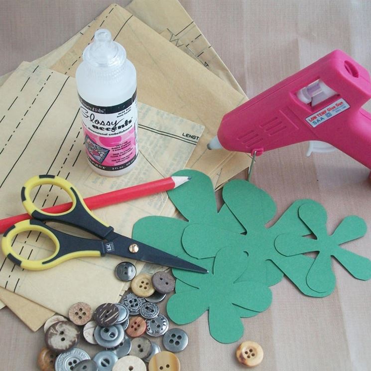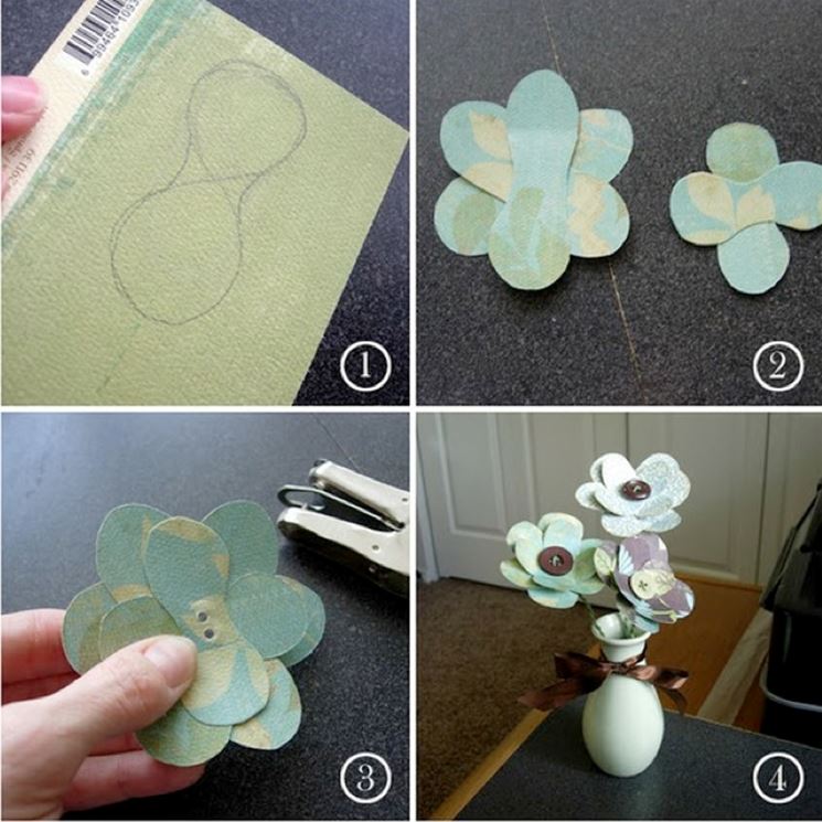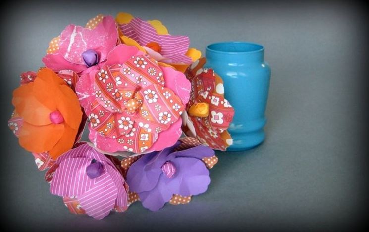 A questo punto, prima di separare i vari strati di carta, con un punteruolo o con un ago grosso, facciamo un buco al centro dei petali che abbiamo appena ritagliato. Possiamo usare come gambo un fil di ferro da rivestire, o un bastoncino di legno, per ultimare i nostri fiori facciamo passare il gambo attraverso il foro praticato e fissiamo con poca colla il primo e l'ultimo petalo. Sfalsiamo i petali in cerchio per dare la forma ai fiori, pieghiamoli sulla mano chiusa delicatamente a pugno, ed ecco i fiori di carta, esecuzione istantanea.Per arricchire i fiori di carta, possiamo fissare allo stelo dei pistilli, ricavati arrotolando su se stessa piccole strisce di carta, impreziositi da perline o gocce di colore.Una volta acquisita maggiore destrezza, possiamo ritagliare delle sagome più complesse, per esempio quelle di un fiore bidimensionale a cinque petali. Procedendo come sopra otterremo risultati diversi ma sempre molto gradevoli.