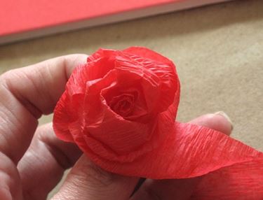 Dopo avere realizzato le strisce di carta crespa faremo alcune prove prima di trovare la lunghezza adatta per creare le rose. Non tagliamo tutte le strisce ad una misura fissa prima di avere fatto alcuni campioni. Partiamo da un capo e fissiamo l’inizio del lavoro con una goccia di colla, arrotolando su se stessa la carta come fosse un tubicino. Quindi teniamo tra il pollice e l’indice l’inizio del lavoro. Con estrema leggerezza e senza stringere mai troppo sulla corolla, continuiamo ad avvolgere la carta intorno. Teniamo sempre tra le due dita tutti gli strati di carta che via via si sommano, per farlo pizzichiamo la base del fiore e qui sì, cerchiamo di stringere il più possibile come a formare un piccolo gambo. Di tanto in tanto, facciamo una piccola plissettatura per creare movimento e simulare la forma di un petalo. Per creare un effetto più voluminoso possiamo ritagliare strisce più larghe, alte sei o sette centimetri e piegarle a metà senza segnare troppo, prima di arrotolare la rosa. In questo modo il bordo esterno della rosa sarà più carnoso e bombato, restituendo la suggestione di avere tra le mani una vera rosa.