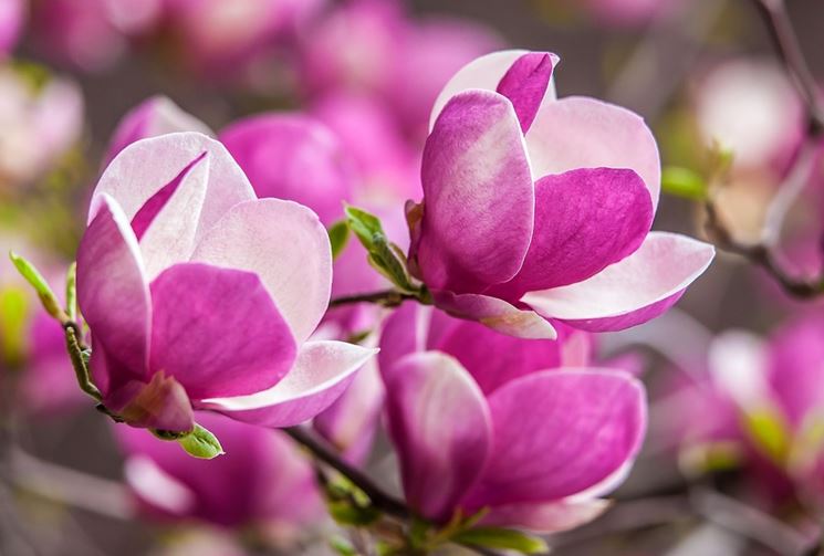I fiori di magnolia si distinguono immediatamente per il loro tipico colore rosato. Le magnolie da fiore arbustive appar