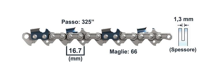 Le maglie della catena sono due, una motrice, montata internamente, che scorre sulla barra e ingrana i suoi den,i al pignone motrice. L'altra maglia è quella di taglio, fissata in posizione esterna, è dotata dei taglienti per il taglio del legno può essere destra o sinistra. Le tre tipologie di maglie sono assemblate in un pacchetto e rese solidali da rivetti di collegamento che mantengono snodabili le giunzioni Le maglie motrici sono anch'esse soggette a usura ma non come i taglienti è consigliabile affilare ad intervalli regolari suggeriti dopo ogni pieno di benzina della motosega. Le maglie di taglio hanno specifici superfici e spigoli di taglio che sono orientati ad angoli precisi che danno profondità e larghezza necessari al taglio del legno. Per provvedere alla manutenzione delle catene sono necessari un set di lime, delle dime di registro per gli angoli di affilatura e una rivettatrice appositamente studiata per i rivetti di fissaggio.