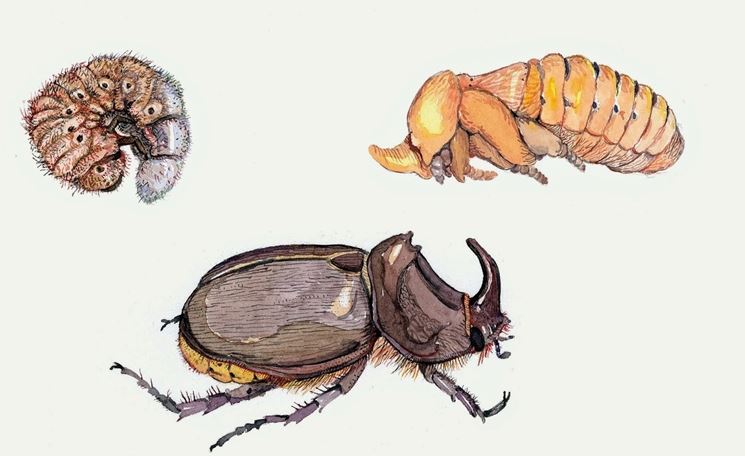 La longevità dello scarabeo rinoceronte varia da specie a specie e dal posto in cui si trova, perché alcuni vivono nei paesi tropicali e alcuni in Nord America e tra questi la lunghezza della loro vita varia molto, ma in genere la durata tipica va da uno a due anni. Gran parte di questo tempo può essere spesa nella fase larvale. Le corna dello scarabeo rinoceronte maschio sono utilizzate per guidare altri maschi verso un coleottero femmina durante rituali di accoppiamento. Le femmine non hanno le corna, ma sono simili agli scarabei normali, e vengono viste meno frequentemente. Lo stadio larvale è appunto molto lungo. Ogni femmina depone circa 50 uova bianche, che si schiudono in larve. Le larve si sviluppano poi in pupe e queste alla fine raggiungono la forma e la dimensione adulta. La nutrizione durante lo stato larvale influirà sullo sviluppo e quindi dimensione dello scarabeo adulto.