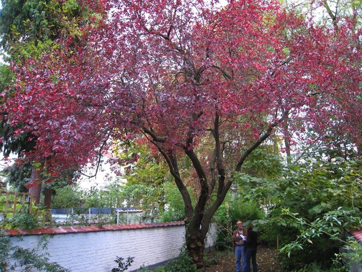 Una pianta a foglie caduche particolarmente bella è il prunus cerasifera nigra. E' un albero particolarmente adatto al giardino grazie alla sua altezza che non supera mai gli otto metri e si caratterizza per la chioma a forma ovale particolarmente folta. La sua bellezza non muta eccessivamente tra l'estate e l'autunno. Le foglie sono brune e si imbruniscono particolarmente con l'avvicinarsi dell'inverno prima di cadere definitivamente. In primavera si riempie di fiori rosa anche se raramente produce dei frutti che sono comunque di numero inferiore rispetto ai fiori. E' un albero che non richiede cure particolari e resiste molto bene sia alla siccità che al freddo. Si consiglia comunque di metterlo a dimora in una posizione soleggiata e di prediligere L'innesto in un terreno ben drenato, fresco e particolarmente fertile.