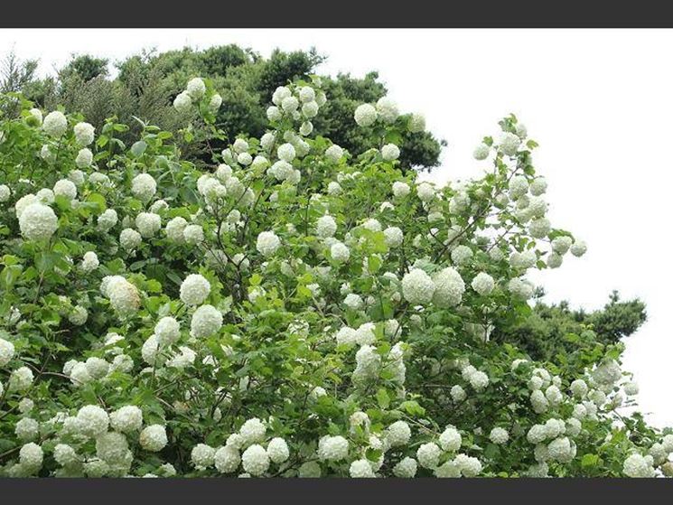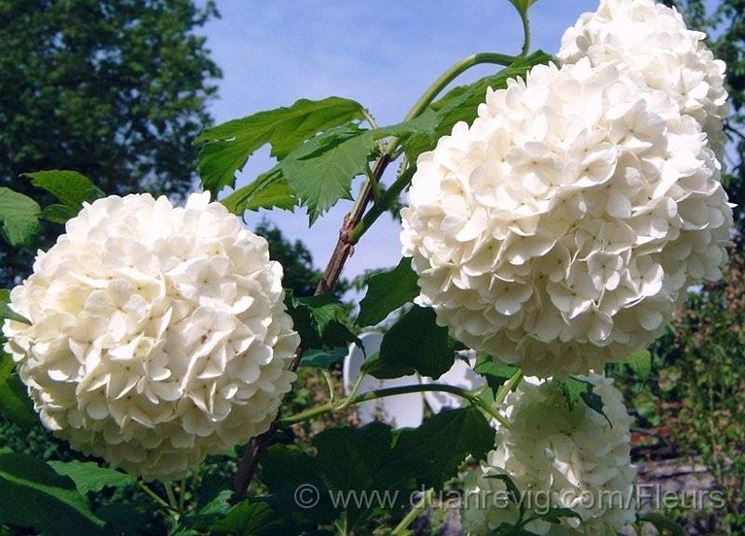 Il viburnum opulus roseum è un arbusto cespuglioso caratterizzato da foglie incredibilmente somiglianti a quelle dell'acero, trilobate e aventi un margine seghettato. Queste hanno un colore verde scuro e tendono ad assumere interessantissime colorazioni rossastre durante le stagioni autunnali. Queste hanno, alla loro base, delle escrescenze somiglianti a ghiandole nettarifere che attirano le formiche le quali svolgono il prezioso compito di difendere la pianta dall'attacco di altri insetti. La vera particolarità di questa pianta è rappresentata dai suoi fiori che sbocciano in inflorescenze di forma sferica, sull'apice esterno dei rami della pianta. I fiori hanno inizialmente un colore verde mela che gradualmente si trasforma in bianco. Le sfere floreali somigliano a surreali palle di neve sospese nel verde di un giardino.