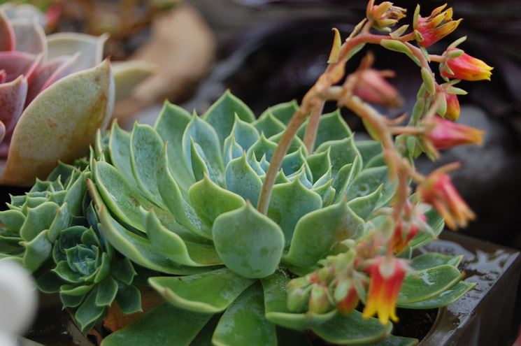 Sappiamo che di piante grasse ne esistono tantissime, piccole e grandi, ma ci occupiamo adesso in particolare dell'echeveria. Si tratta di una graziosissima pianta originaria del Messico, come tutto il gruppo delle Crassulacee a cui appartiene. Il nome le deriva dal pittore della sua terra, Atanasio Echeverria, famoso per i suoi dipinti di piante.Questa succulenta ha conservato le foglie, che sono carnose, di forma grosso modo ovale, ma leggermente differenti nelle varie specie. Produce dei fiori, generalmente arancioni, ma anch'essi leggermente diversi da specie a specie, che durano a lungo.Le varietà più comuni sono l'echeveria coccinea, dalle foglie piuttosto sottili e gonfie, con fiori rossi con margini gialli.Abbiamo l'echeveria agavoides, con foglie più appuntite e fiori simili alla varietà precedente.Echeveria elegans: foglie concave ricoperte da una patina biancastra e fiori rosa.L'echeveria pubescens è caratterizzata da foglie ricoperte da peluria argentea e con fiori rossi o arancioni.Infine l'echeveria derembergii, che ha foglie corte e marginate di rosso, e fiori arancioni.Tutte hanno la caratteristica forma a rosetta.