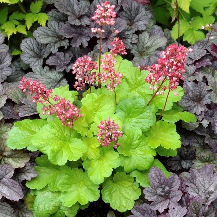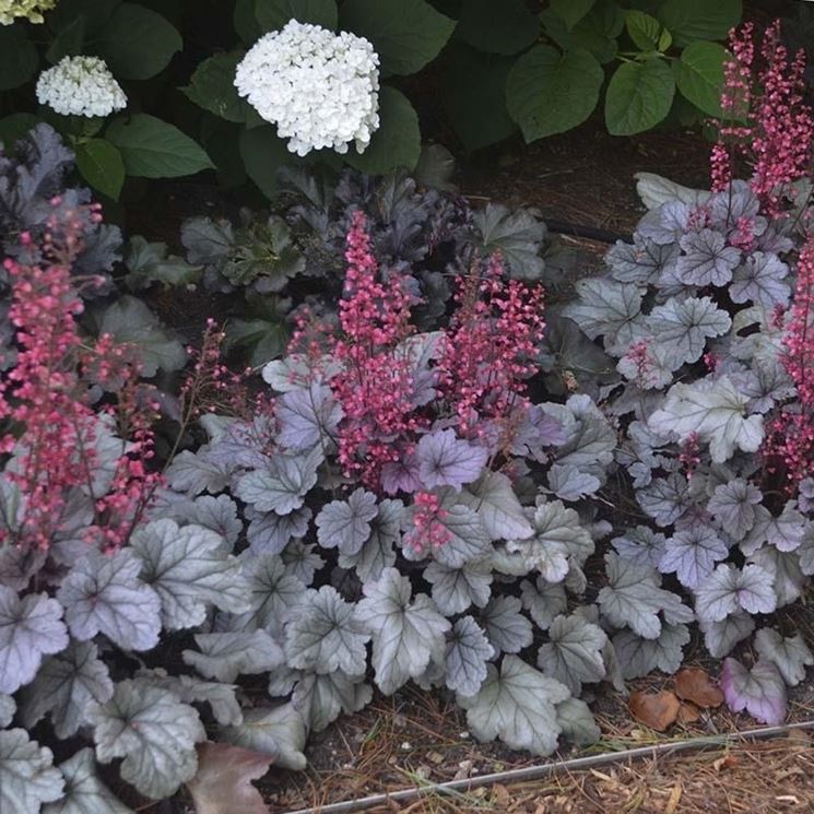 Le heuchere , originarie delle aree montuose del Nord America, hanno un apparato radicale superficiale e rizomatoso che le e porta ad avere uno sviluppo orizzontale e a formare, nel medio-lungo periodo, un fitto e gradevole cuscino . Ad attirare lo sguardo sono soprattutto le foglie, arrotondate e lobate, persistenti in buona parte della nostra penisola: la forma è senza dubbio elegante, ma l’aspetto peculiare è la loro colorazione. Le cultivar in commercio, infatti, sono disponibili in un’ampissima gamma di cromie, dalle più delicate alle più vivaci, ideali per creare composizioni ricche di contrasti. I fiori, portati su lunghi steli per tutta la bella stagione, non sono appariscenti, ma armonizzano perfettamente negli abbinamenti, donando eleganza e leggerezza.