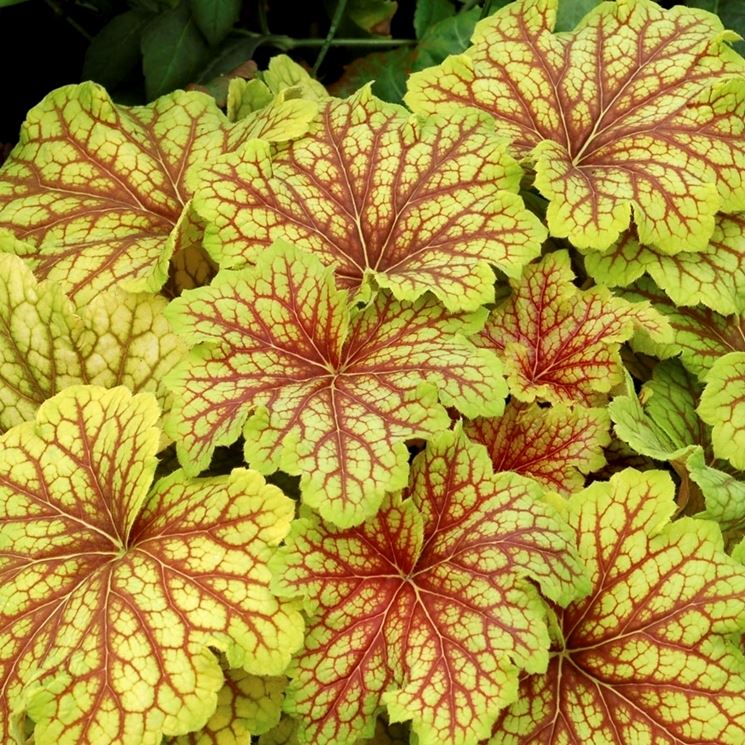 Tra le varietà a foglia rossa segnaliamo “Paprika””Georgia Peach” e “Coral Bells”; tra quelle arancio “ Marmelade” e “Crème Brûlée”, tra quelle a foglia verde acido “Lime Mermelade”, “Lime Rickey” e la particolarissima “Electra”, dalle nervature rosse. Utilissime per creare contrasti sono quelle a foglia scura, porpora o violacea (“Obsidian”, “Purple Palace”, Plum Pudding” “Midnight rose”, singolare per le macchie fucsia) e quelle dalle sfumature e nervature argentate (Silver Blush, Silver Scrolls e “Green Spice” che ha anche accenni verdi e rossi).