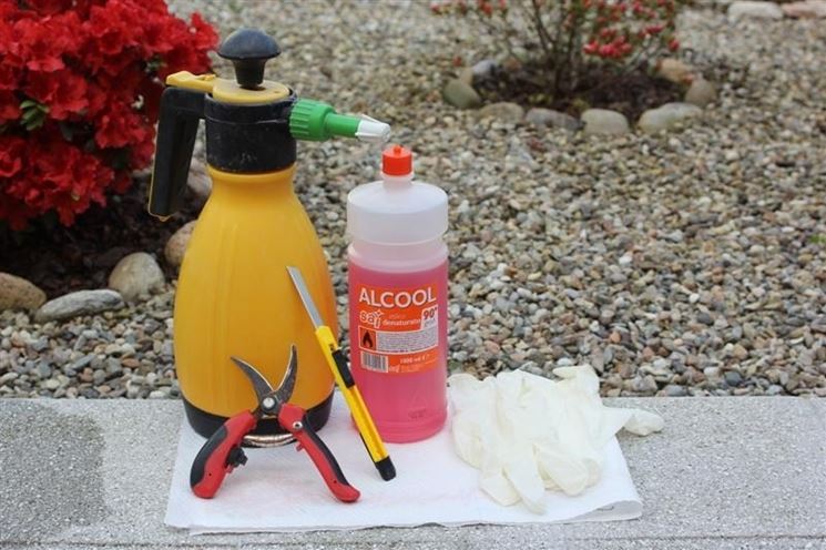 Quando si potano le rose bisogna utilizzare un'attrezzatura appositamente predisposta per eliminare le parti appassite o eccedenti senza arrecare danni alla pianta. Gli strumenti necessari all'esecuzione di una corretta potatura sono due: le cesoie per i rami sottili e il segaccio per i rami di maggior spessore. Prima dell'utilizzo, questi attrezzi devono essere accuratamente disinfettati per evitare eventuali contaminazioni da parte di funghi ed altri agenti patogeni. Le attrezzature vivaistiche infette sono uno dei più importanti veicoli di diffusione delle patologie più gravi: gli strumenti da taglio, in particolare, trasmettono il contagio in modo diretto perché sono a stretto contatto con i tessuti interni delle piante. Per procedere alla disinfezione è sufficiente trattare le cesoie e i segacci con un prodotto a base di rame o con alcool etilico.