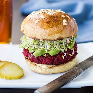 Ecco una ricetta per realizzare un burger vegano un po' alternativo, di un bellissimo colore viola-scarlatto che apprezzeranno sia i vegani che gli onnivori. Per realizzarlo potete utilizzare sia la barbabietola rossa fresca arrostita in forno con un po' d'olio dopo averla tagliata a pezzetti, sia quella precotta che si trova comunemente nei supermercati. Bollire a parte 50g di quinoa con 2 parti e mezzo di acqua e scolarla. Frullare grossolanamente la barbabietola e poi mescolarla alla quinoa cotta, aggiungere sale, pepe, un po' di cipolla ed aglio tritati e legare il tutto con del pangrattato. Formare dei burger e cuocerli in forno o su una piastra calda. Se volete proprio esagerare con le proprietà benefiche servire i burger in mezzo ad un buon panino con una salsa realizzata con tahini ed avocado schiacciato.