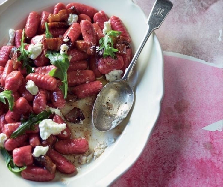 Realizzare qualcosa di diverso quando si hanno ospiti a cena non deve per forza diventare un incubo. Stupire con poco ecco un primo buono, semplice e sopratutto bello da vedere. Per realizzare questi gnocchi avete bisogno di 300g barbabietole rosse cotte, quindi vanno bene quelle precotte, importante è tagliarle a fette e schiacciarle in mezzo a della carta assorbente per togliere più umidità possibile. Frullare le barbabietole ed impastarle con 300g di farina 0, 50g di parmigiano, 2 uova ed un pizzico di sale. Se necessario aggiungere altra farina per rendere l'impasto morbido ed asciutto. A questo punto realizzare gli gnocchi e le caratteristiche rigature facendo scivolare ogni gnocco sui rebbi di una forchetta o sull’apposito arnese in legno, schiacciandoli un po’ con il pollice mentre li fate ruotare per incidere la la forma. Cuocerli in acqua e servirli conditi con burro e salvia.