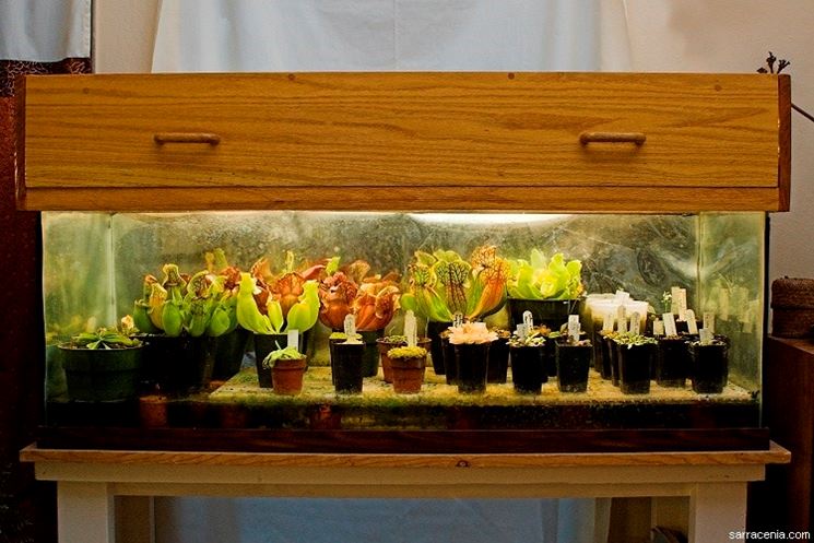 Solo alcune specie di piante carnivore possono essere coltivate in terraio tra le quali: dioanea muscipula, clephalotus follicularis, drosera capensis, le utricularia e le nepenthes. Hanno bisogno di un clima umido, poco ventilato ma soprattutto pieno di luce e temperato. Il terraio non è altro che un contenitore generalmente di vetro o plastica che impedisce l'uscita dell'acqua ma garantendo il riciclo dell'aria. La caratteristica fondamentale per un terraio è l'illuminazione, che può essere naturale o artificiale. Per quella naturale non ci sono problemi ed è preferibile rivolgerlo a sud. Mentre per quanto riguarda l'illuminazione artificiale dobbiamo dotarci di una lampada ad incandescenza adatta che copra tutto lo spettro luminoso richiesto dalle nostre piantine. Altra prerogativa importante è la costante manutenzione con una particolare cura dell'igiene del nostro terraio poichè si potrebbero formare muffe dannose per le nostre piante, causate magari da foglie morte o altre parti organiche in decomposizione.